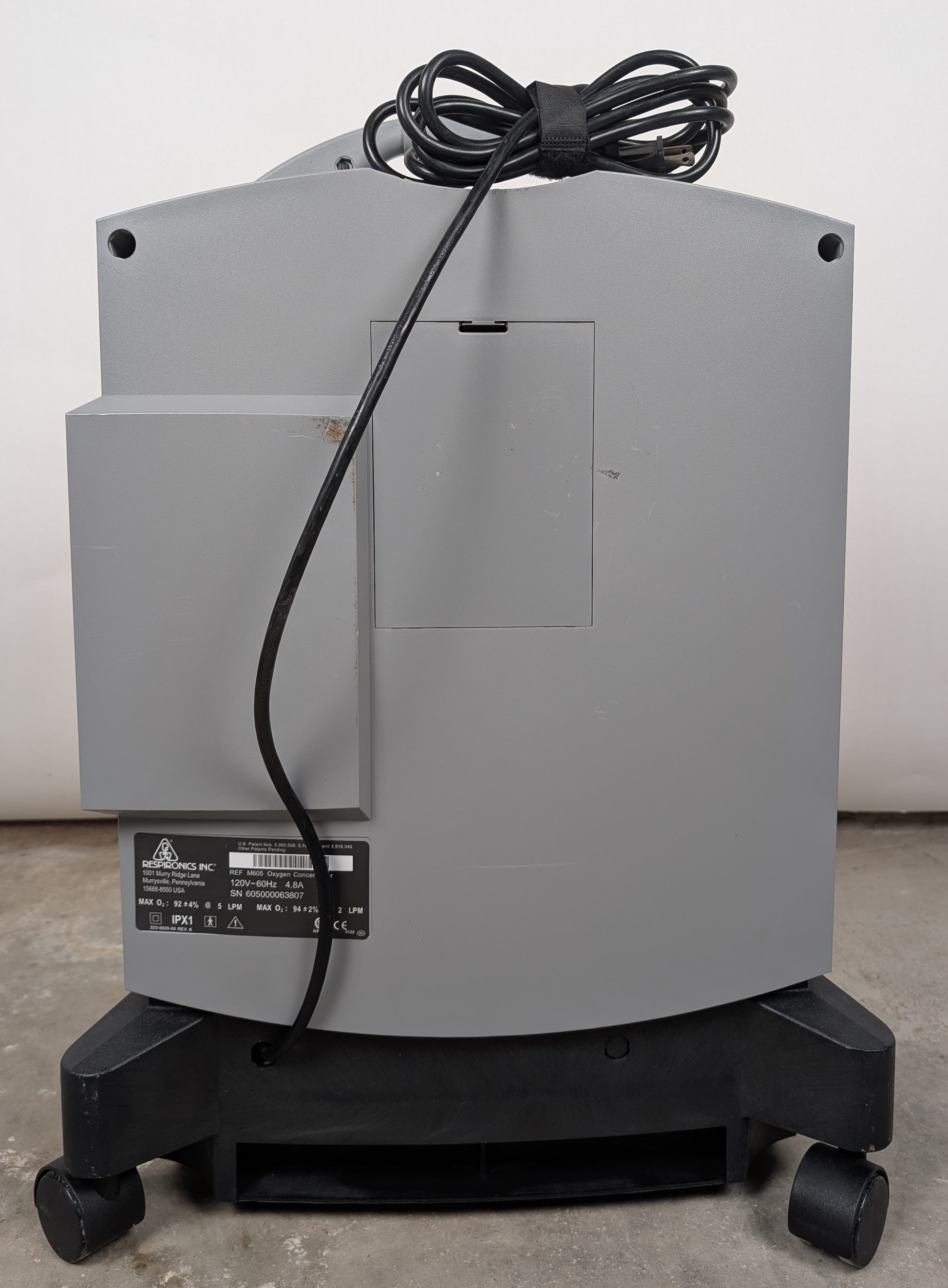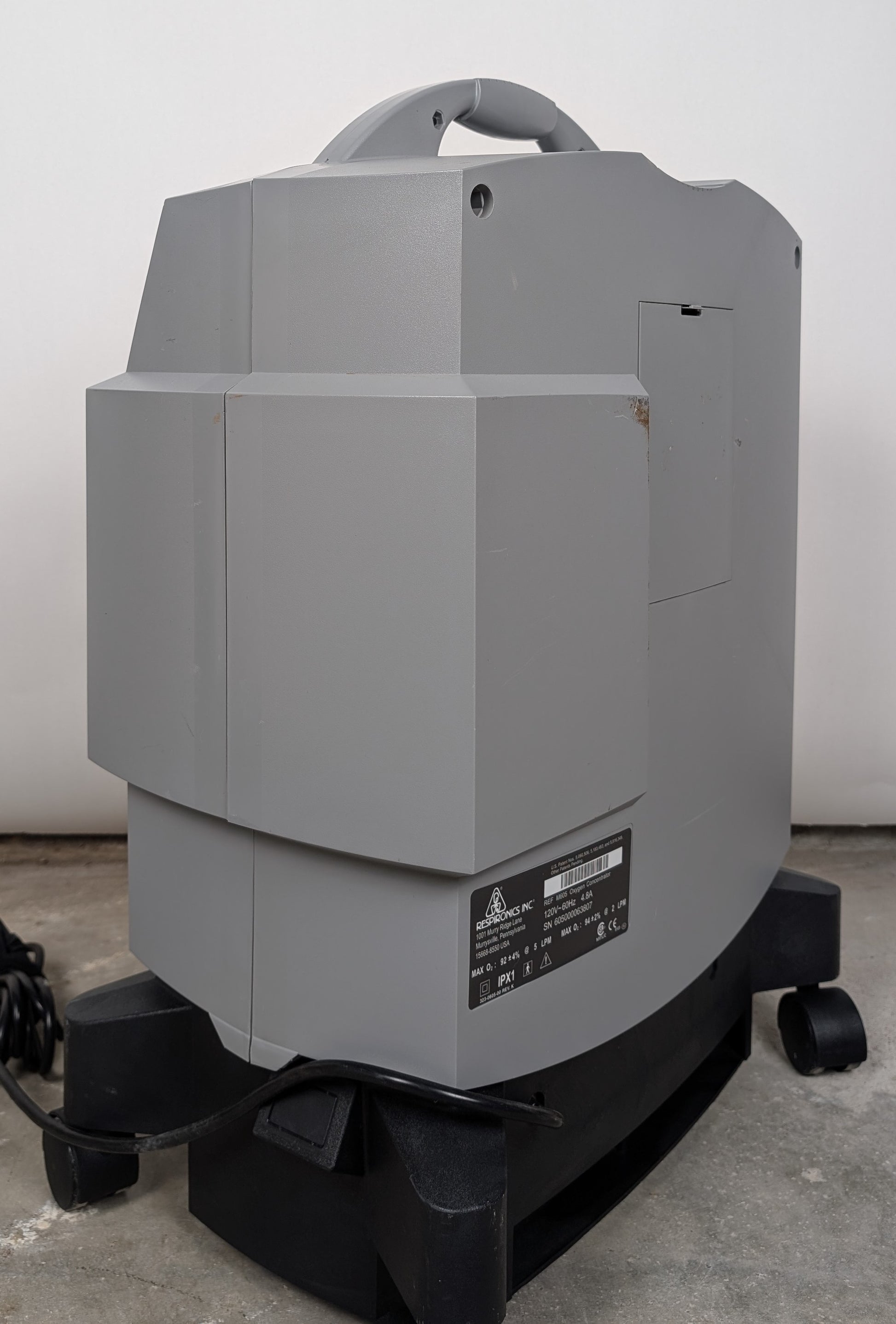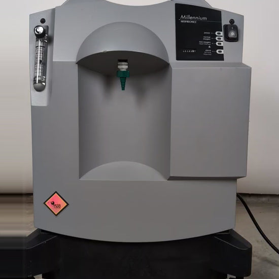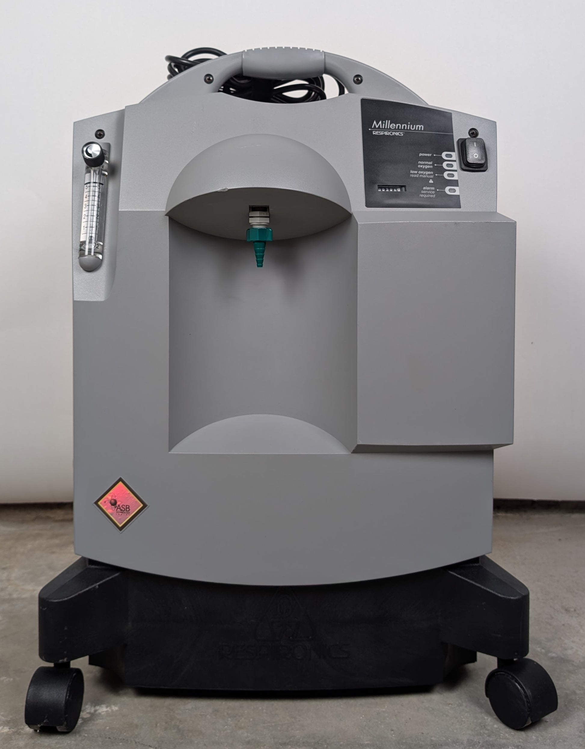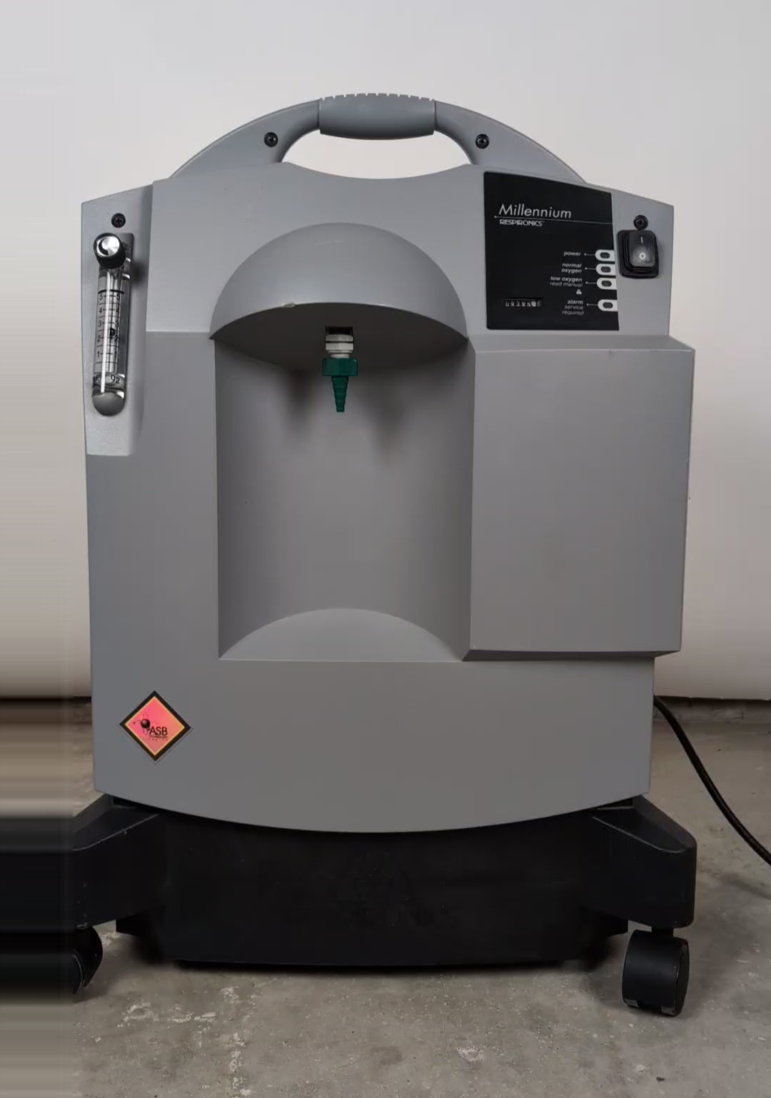 The Respironics Millennium M605 Oxygen Concentrator delivers reliable medical-grade oxygen therapy with proven performance. This 5-liter per minute unit features Respironics' advanced sieve bed technology and twin-head compressor design for consistent oxygen delivery. Unit shows 9,795 hours of operation, powers on, and compressor operates normally. Ideal for healthcare facilities, home care providers, or as a backup oxygen source. Includes integrated carrying handle and durable caster wheels for easy transport. Unit has been functionally tested - powers on and compressor runs, however oxygen purity output has not been verified and will require professional calibration before clinical use.